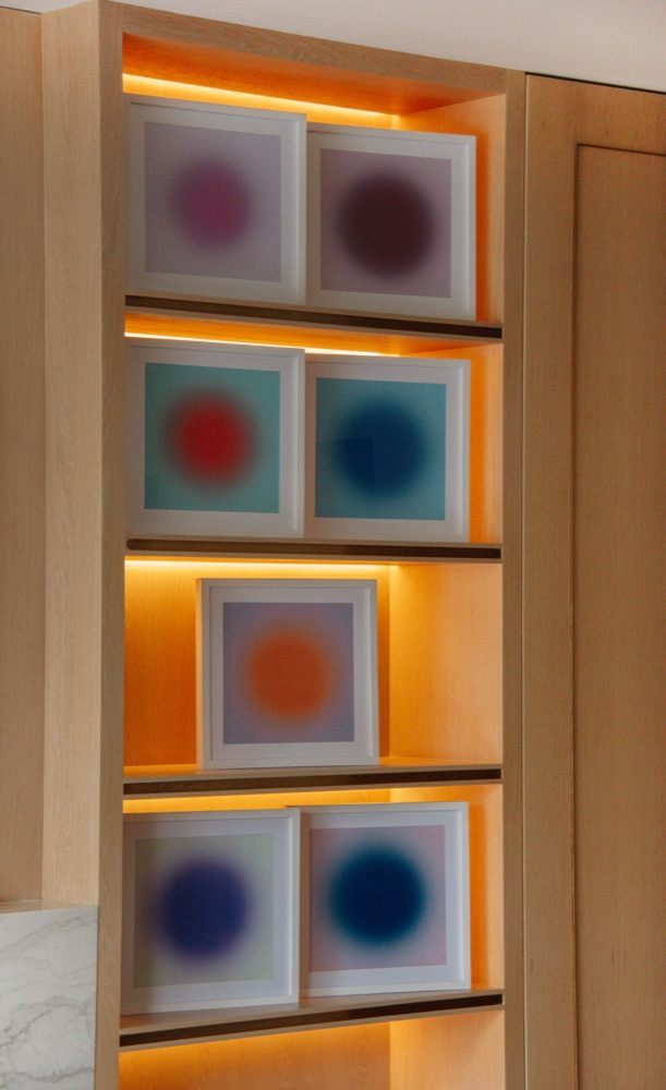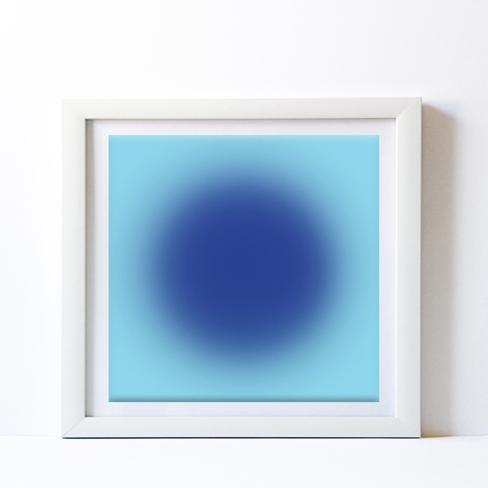 CUADRO DE TIE DYE AZUL CIELO CON AZUL REY ENMARCADO EN COLOR BLANCO 45 X 45 CM.