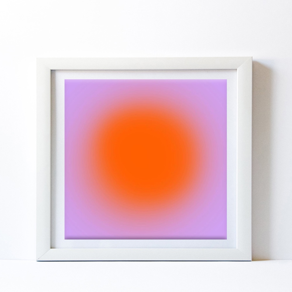 CUADRO DE TIE DYE MORADO CON NARANJA ENMARCADO EN COLOR BLANCO DE 45 X 45 CM.