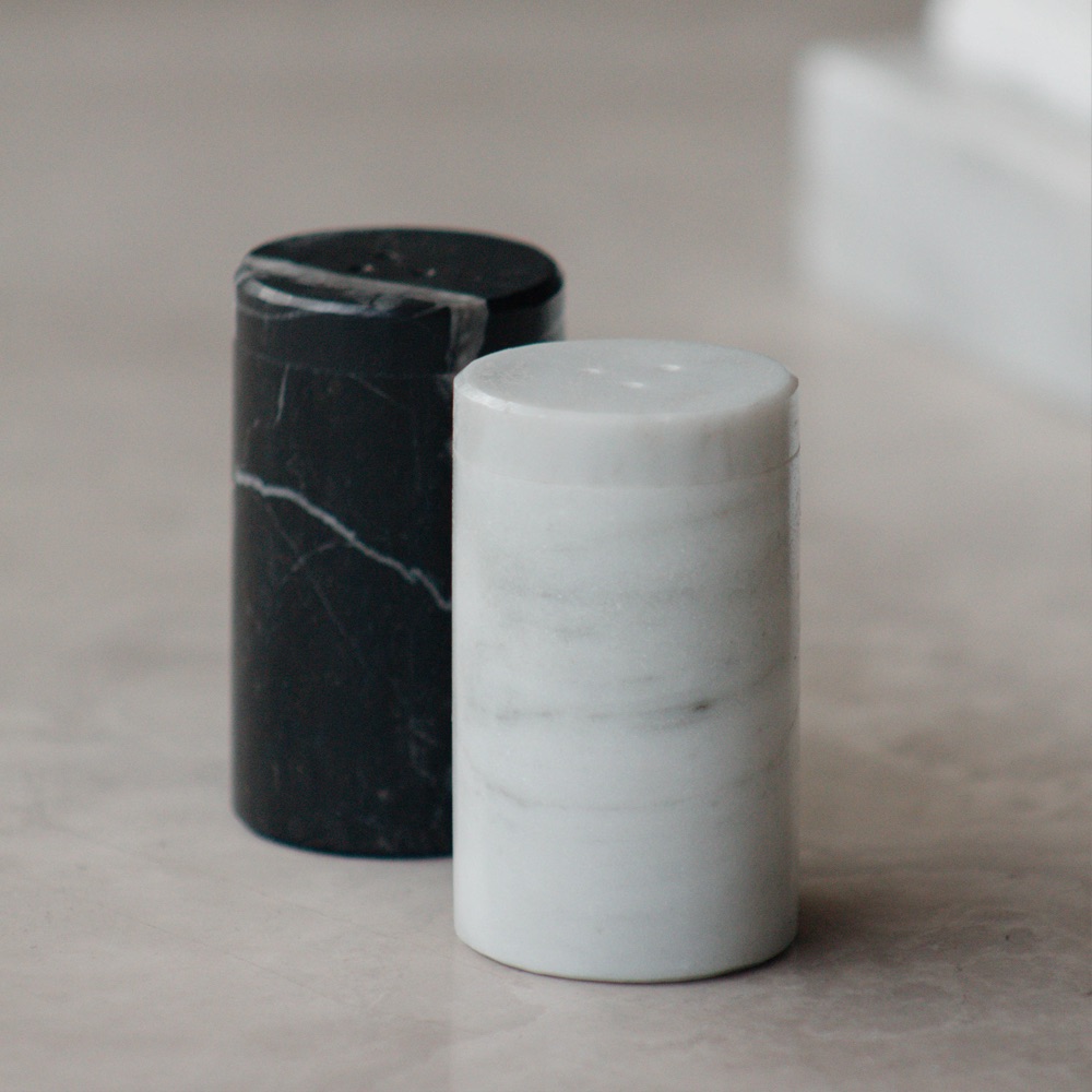 SET DE SALERO Y PIMENTERO EN MÁRMOL BLANCO BEGO EL SALERO Y NEGRO QUERÉTARO EL PIMENTERO DE 4 X 7 CM.