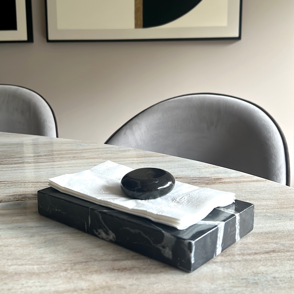 SERVILLETERO RECTANGULAR EN MÁRMOL NEGRO QUERÉTARO CON ACABADO SEMI-MATE Y AVIONCITO PARA PISAR LAS SERVILLETAS 12 X 22 CM.