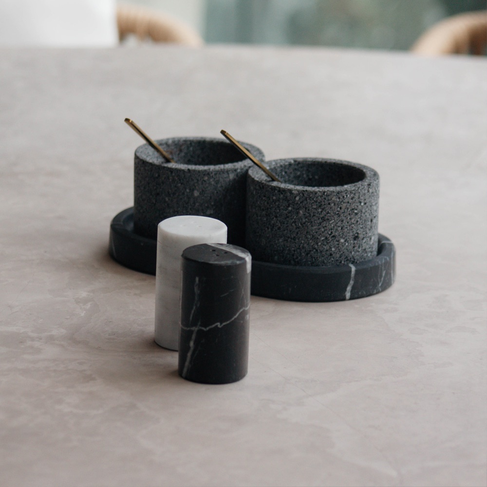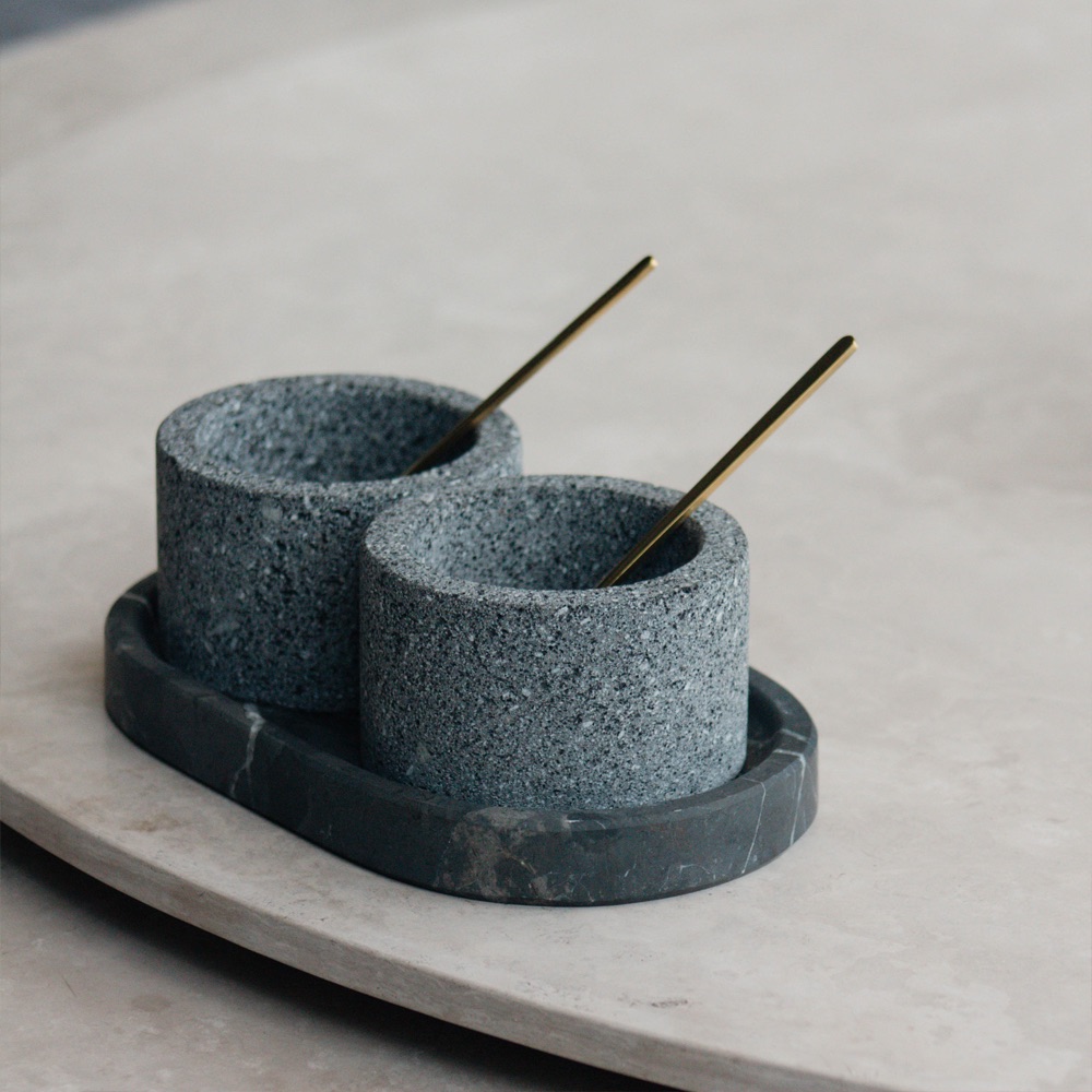 SET DE 2 SALSERAS EN PIEDRA DE RECINTO CON BASE EN MÁRMOL NEGRO QUERÉTARO Y 2 CUCHARAS. MEDIDAS: 19.5 CM LA CHAROLA Y LOS SALSEROS 8.5 X 6 CM.