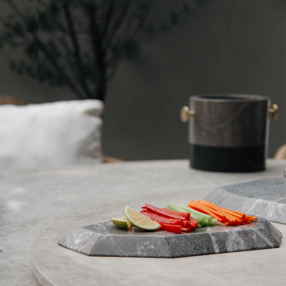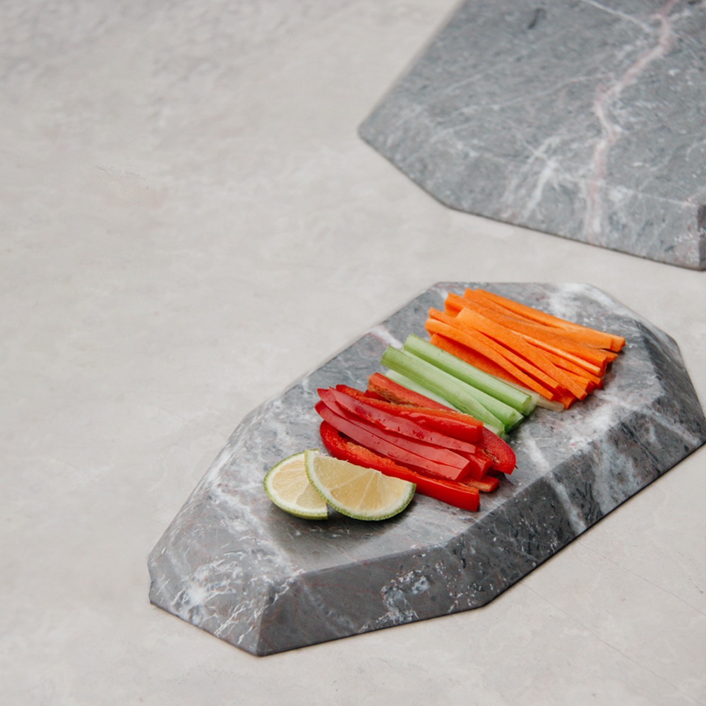 TABLA ASIMÉTRICA EN MÁRMOL GRIS TEPEACA CON ACABADO SEMI-MATE DE 17 X 28 CM. (INCLUYE UN CUCHILLO DE ACERO INOXIDABLE CON MANGO DE MADERA)